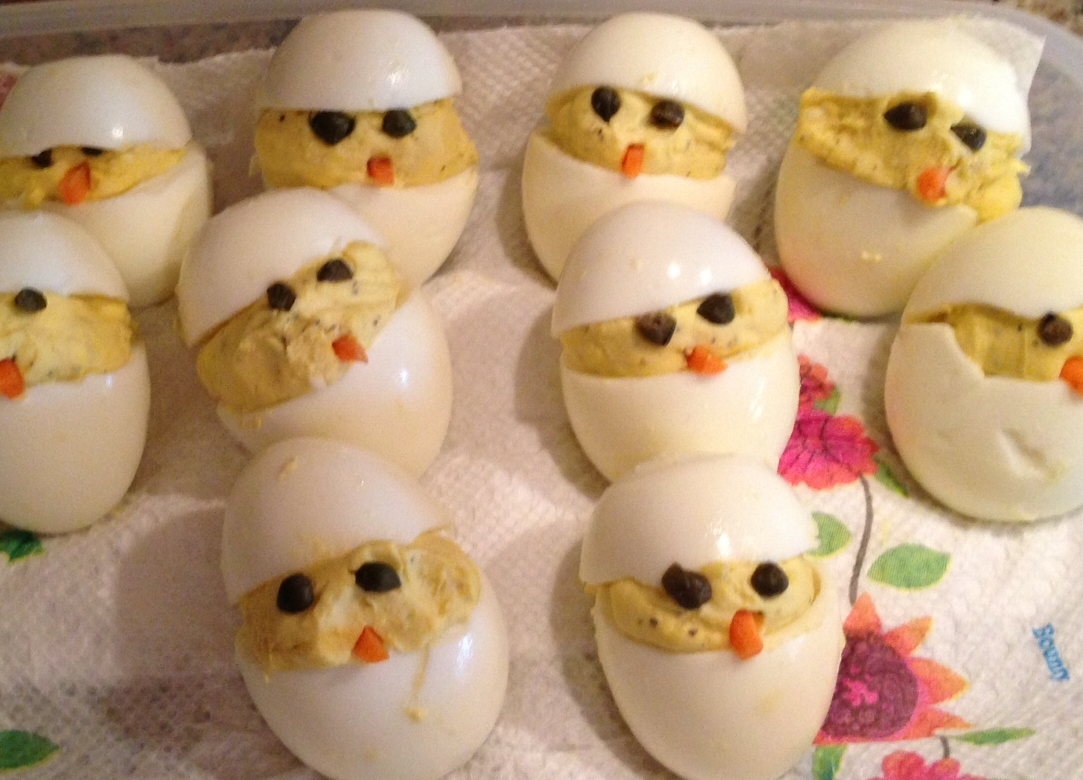 Before Easter my daughter was wandering around Pinterest and came up with a picture of an Easter version of deviled eggs. I’m not very creative in the cooking department, but I can devil an egg, so I thought to myself – Challenge Accepted!