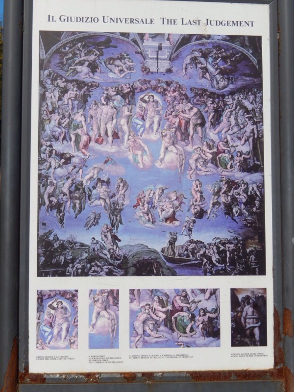 Photographs are not allowed to be taken in the Sistine Chapel. The tour guides take you to the museum gardens near the chapel and explain what you will see. There are panels with pictures of all of the art work displayed for their tutorial. This is a picture of The Last Judgment from one of those panels.