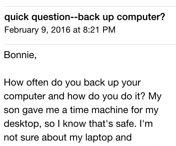 Honestly, I thought her account had been hacked. A time machine for her desktop? Asking me for advice about backing up my computer? Clearly we need to spend more time getting to know each other.