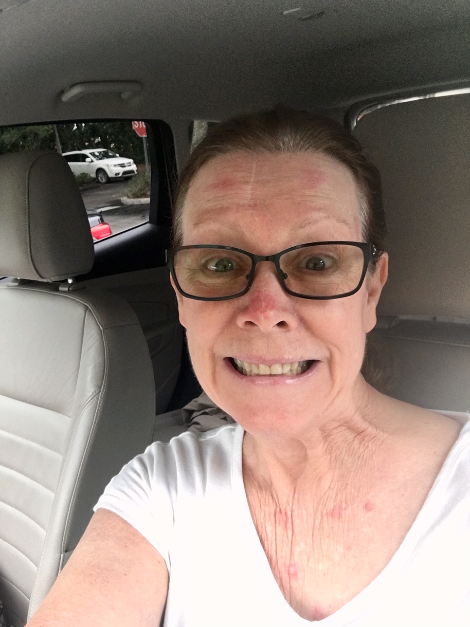 This is what I looked like afterwards. Warning, no make-up. Now you, Bob, and my dermatologist are the only ones who get to see me like this. Feel privileged and always use a good sunscreen of 50 SPF or above. If they had that when I was a kid maybe I wouldn’t come out of the dermatologist’s office every six months looking like I was attacked by a swarm of bees.