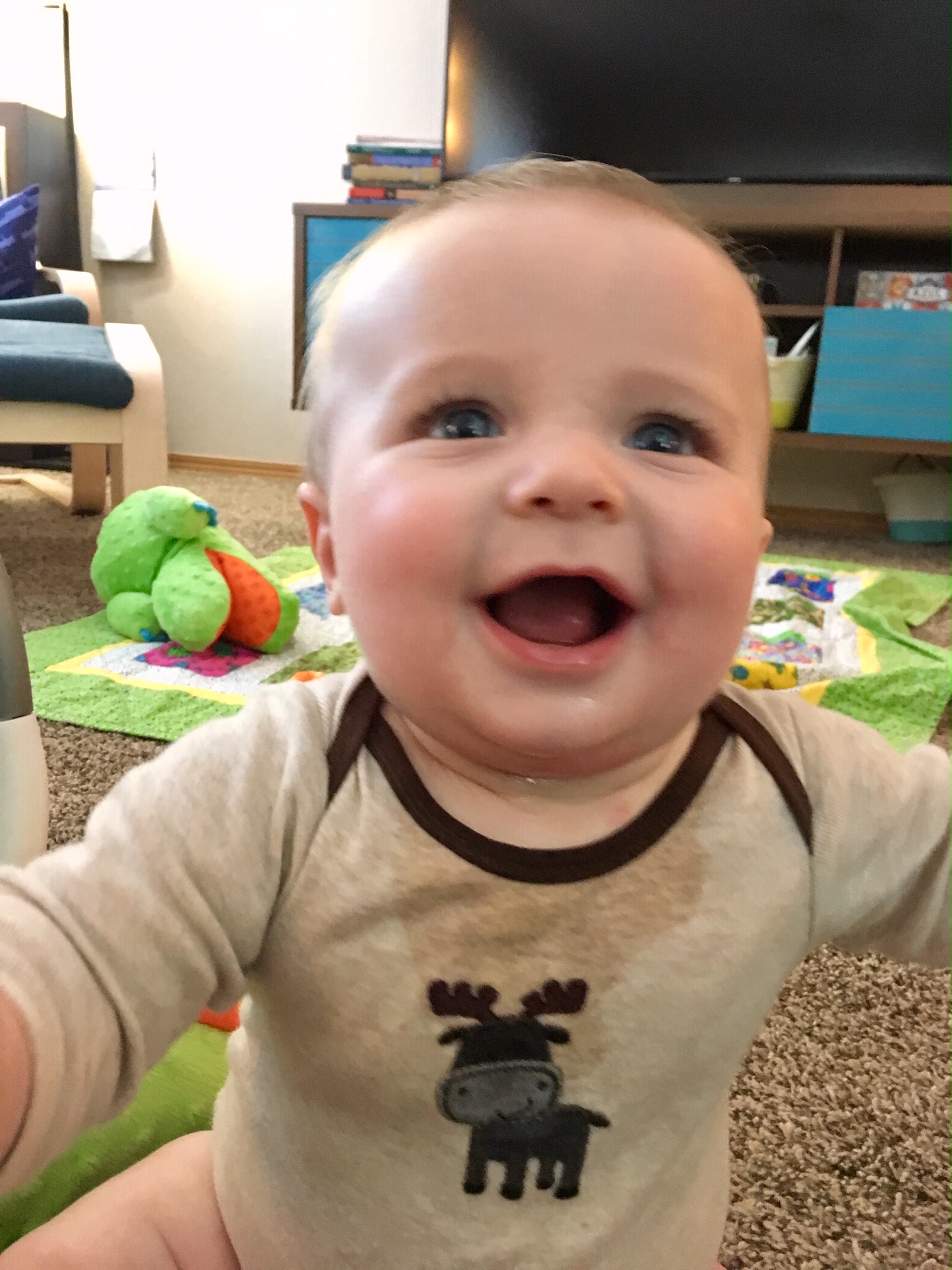 As much fun as it’s been, I still felt the need to respond to these outbursts, so I would stick my fingers in his mouth or zerbert his neck. When things really ramped up, I resorted to making myself disappear, only to reappear seconds later with an emphatic peek-a-boo. This would bring a stilled, confused silence followed by bouts of laughter.