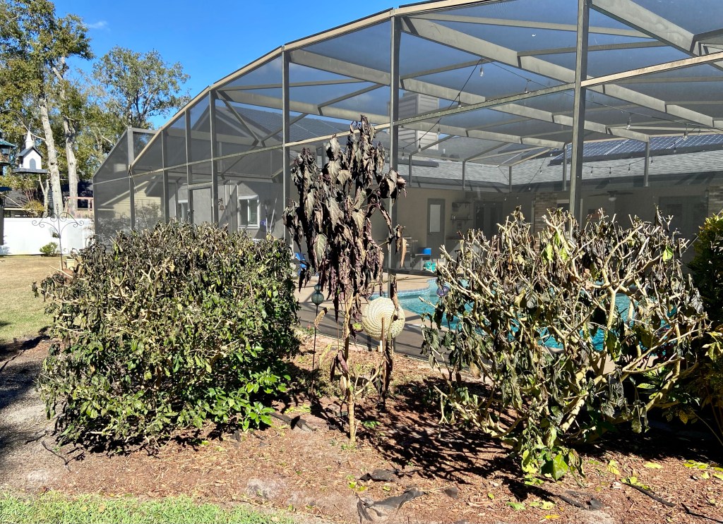 January 30 was a perfect manatee viewing day. The weather had been very cold the night before. How cold? We had a hard freeze and our gardens told the story. We woke up to 32 degrees. A hard freeze means several hours below freezing, and this is what happens to cold-sensitive plants. They may come back. In a few weeks we’ll know for sure. It might be time to rethink this garden.