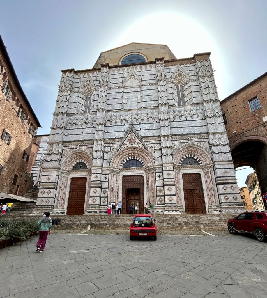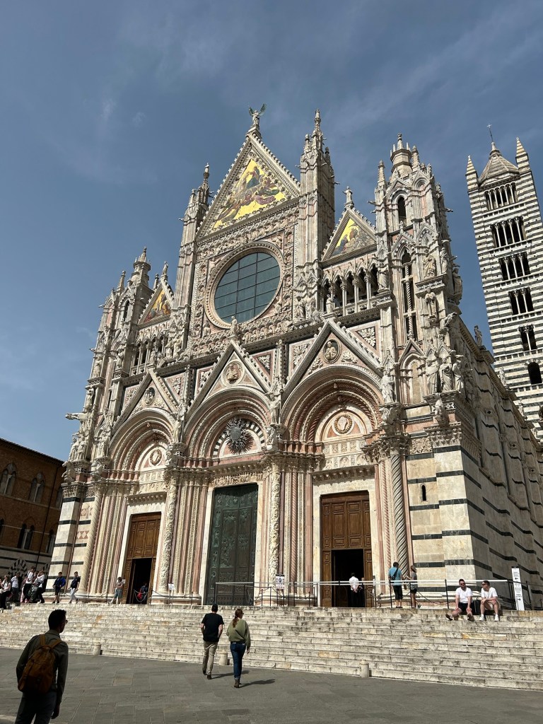 This gothic-style cathedral towers over the surrounding square. Inside of it you are treated to amazing architecture, stained glass windows, and the art of masters such as Donatello and Michealangelo. The construction took place roughly between 1215 and 1263. The gold on the top front of the façade shines differently throughout the day as the sun reflects off it. Inside and out are horizontal stripes prompting me think of Where’s Waldo and making me wish I had worn my black and white striped shirt for a little extra fun. The stripes are actually white and greenish-black marble. Black and white are the colors of Siena.