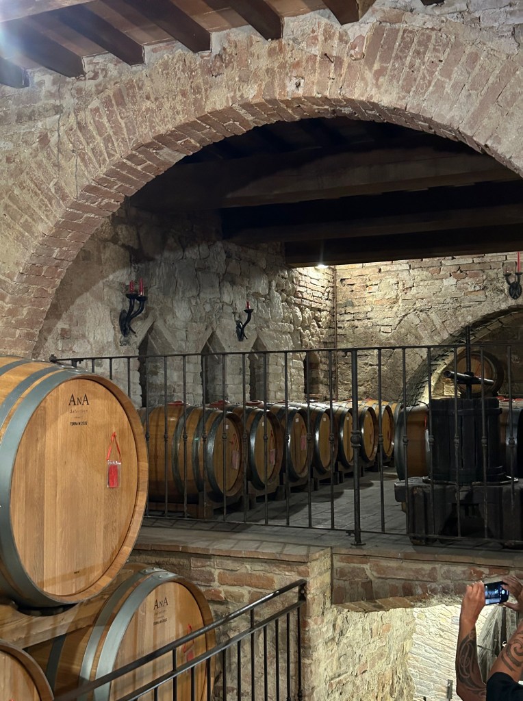 I looked at those huge barrels and never once imagined anyone having to clean them out. Kind of like the top of the refrigerator or the backseat of a mom’s minivan, I assumed they never got their due attention. But, in order to have great wine, periodically those barrels have to have the sediment removed and that is a job for a big wine lover of small stature. Notice the bottom of the barrel where the faucet is. The wood looks like a cartoon mousehole with a locking mechanism affixed to it. That gets removed and someone crawls through the hole to extricate sediment from the barrel. Sarah is holding up a video on her cell phone that shows a man climbing through that hole. That is commitment to good wine!