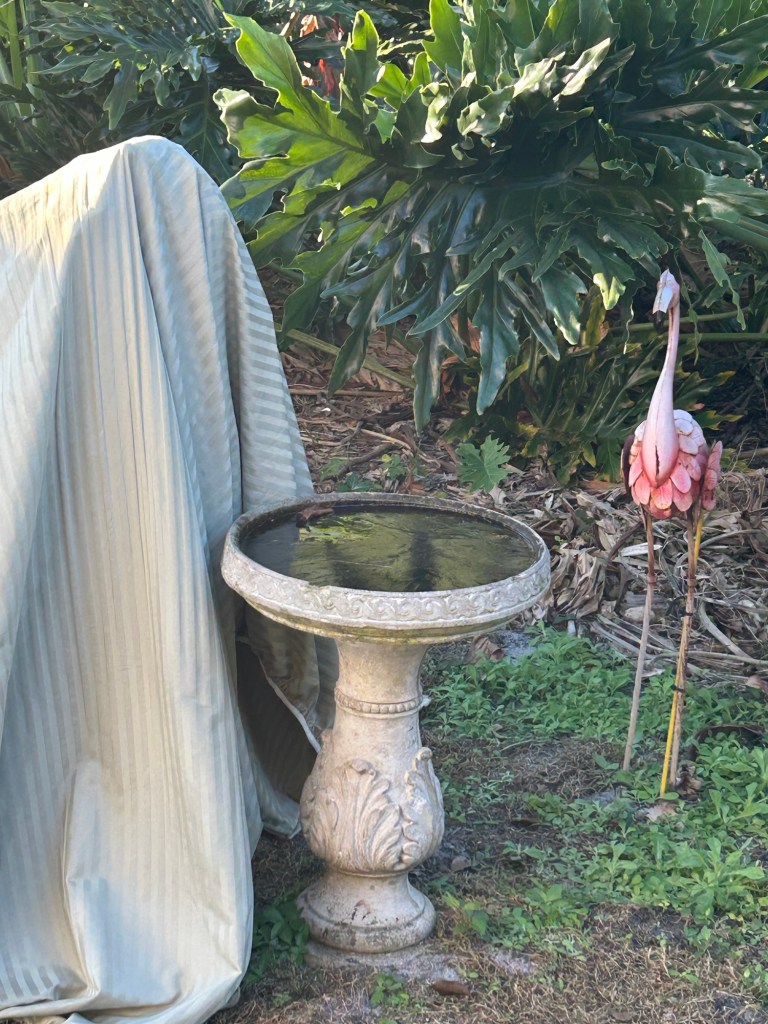 My Florida backyard enduring winter, complete with pink flamingo statuary, frozen birdbath, and covered Camellias to protect the buds.