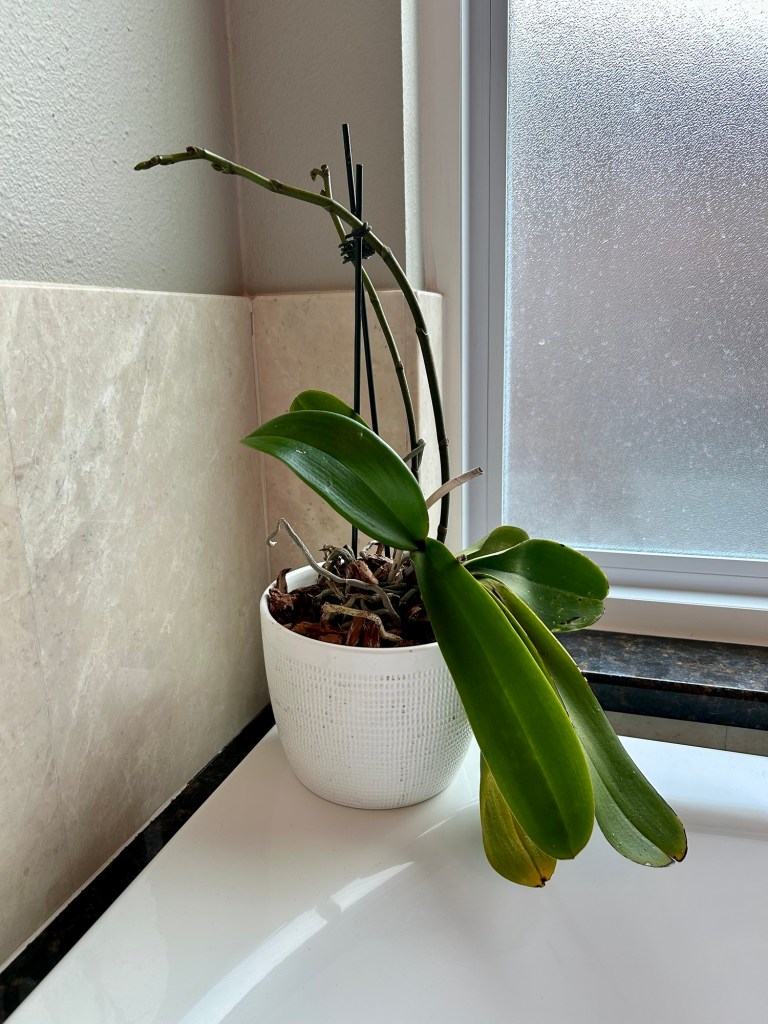 My orchid’s happy place is our bathroom, which gets the morning sun.