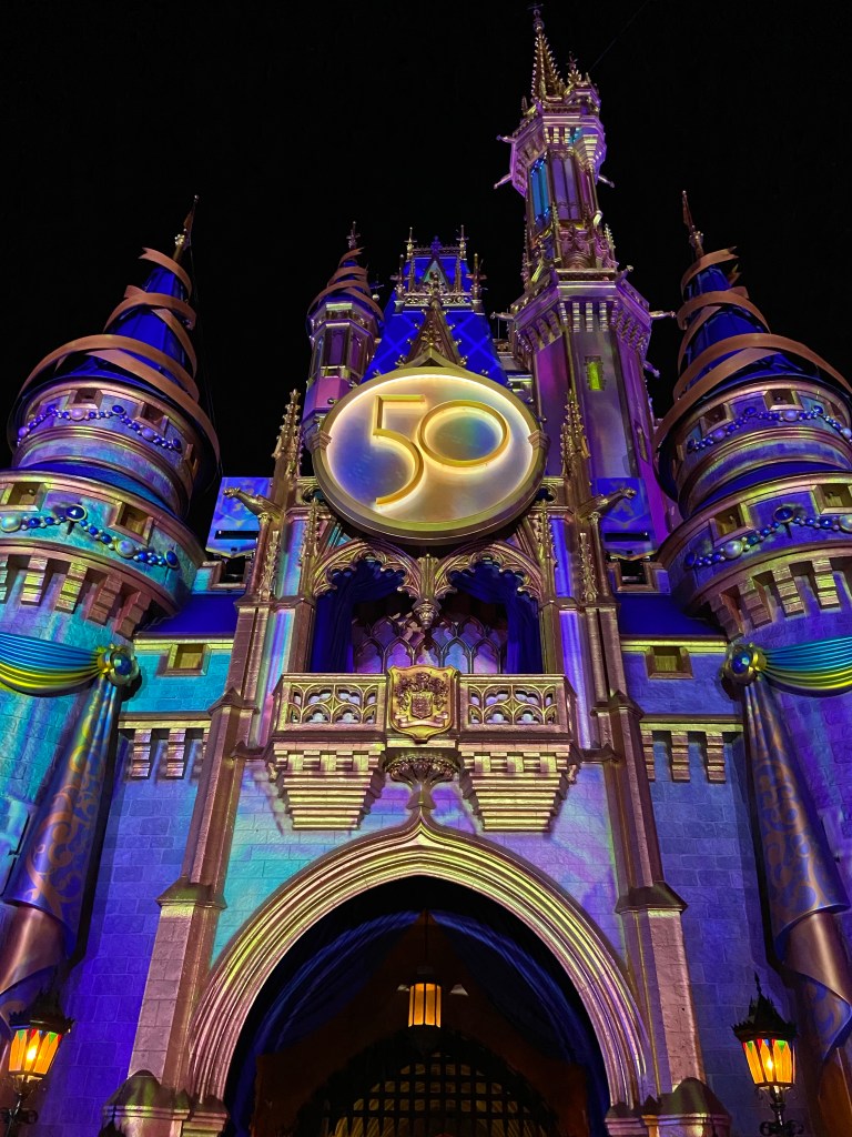 I especially wanted to see the Magic Kingdom at night before the 50th anniversary celebration ends, so last Thursday night, Bob and I went out to dinner and headed to Disney. We would enjoy the magic more accompanied by grandchildren, but for one night we just wanted to see the 8:15 Disney Enchantment, a 50th anniversary nighttime spectacular with fireworks and projection effects on Cinderella’s castle.
