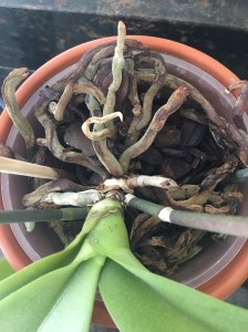 After a good rain, I’ll remember them and pour off excess water, so they don’t keep wet feet, and then they are on their own. Periodically I check to see if they are sending out a shoot. I’ve had my current three orchids for several years, but one has been a problem child. The closest thing to corporal punishment for an orchid is repotting it. It doesn’t feel good at the time, but it should yield new growth.