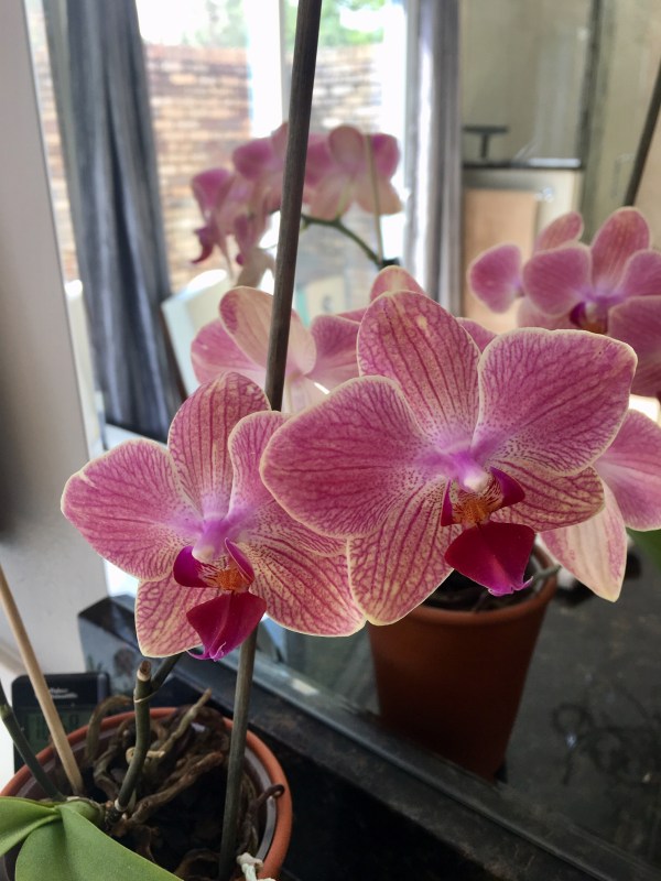 My orchid’s happy place is our bathroom, which gets the morning sun.