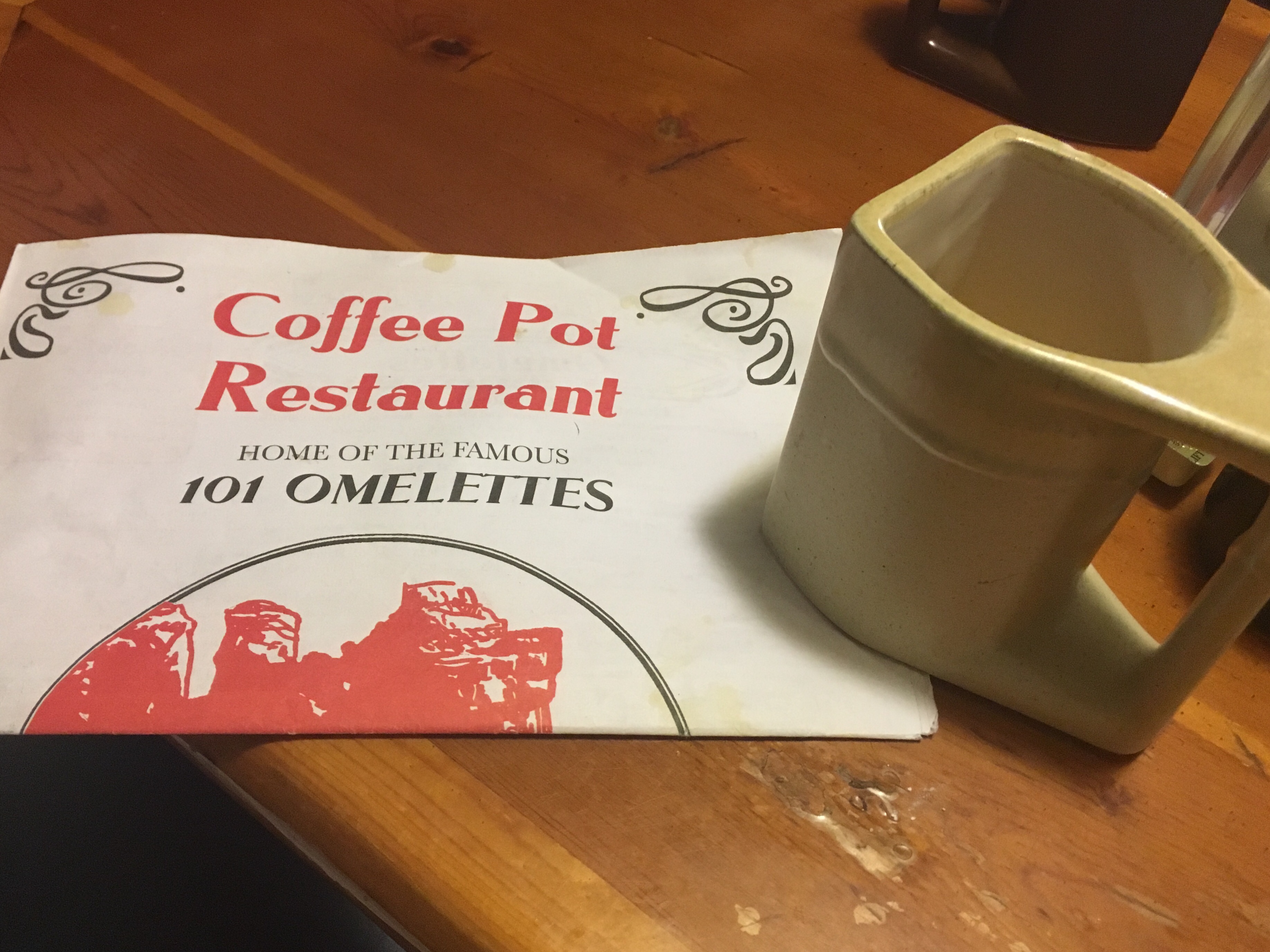 The building was formerly owned by Jane Russell, which is part of its claim to fame. It’s popular with locals and tourists alike. I tripped down a ramp and ended up chatting with a lady named Lilliamm, who made sure I was okay (I was). She has been going to breakfast there for 30 years. Impressive. Another claim to fame for the Coffee Pot is their 101 omelets. I figured by now Lilliamm would have tried them all, but she doesn’t even like omelets. I had an immediate connection with her. The food is amazing and the staff is friendly. It’s right on 89A. We could have walked there from our resort, but like I said, it’s been too cold for me to ruin breakfast by taking an early morning walk in the cold.